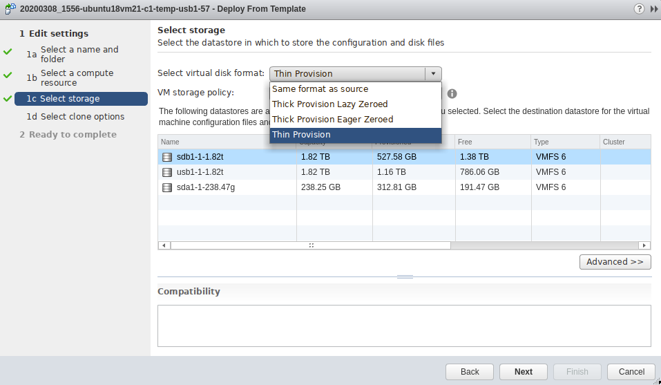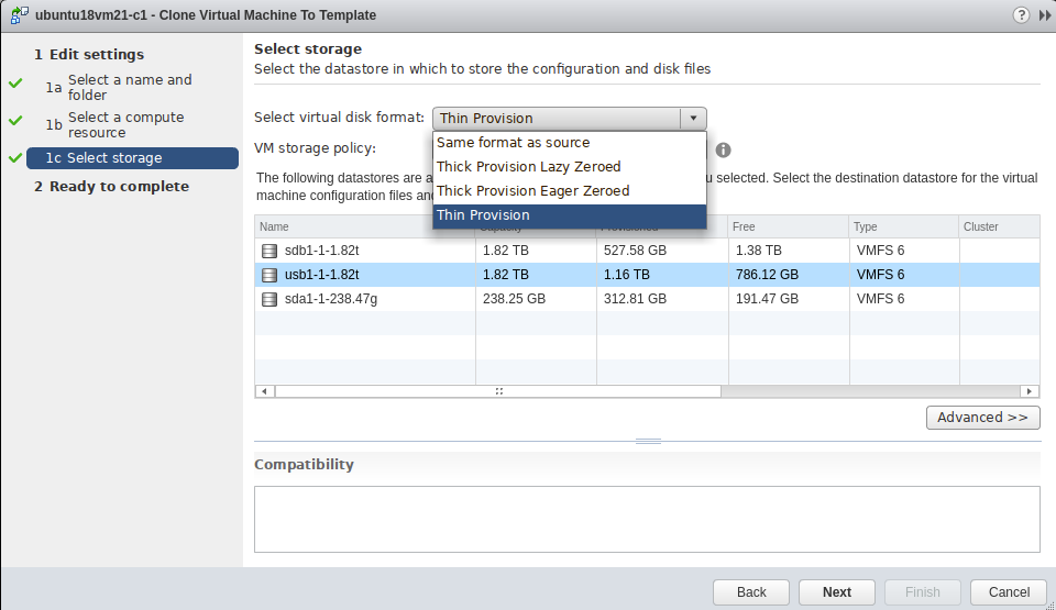 4. Select storage and virtual disk format: usb1-1-1.82t and Thin Provision, then click Next