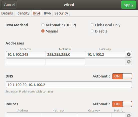 After powering on the new ubuntu virtual machine, you may need to edit Wired Settings to your network environment in order to completely restore and control nextcloud system. Please review image below as an example.